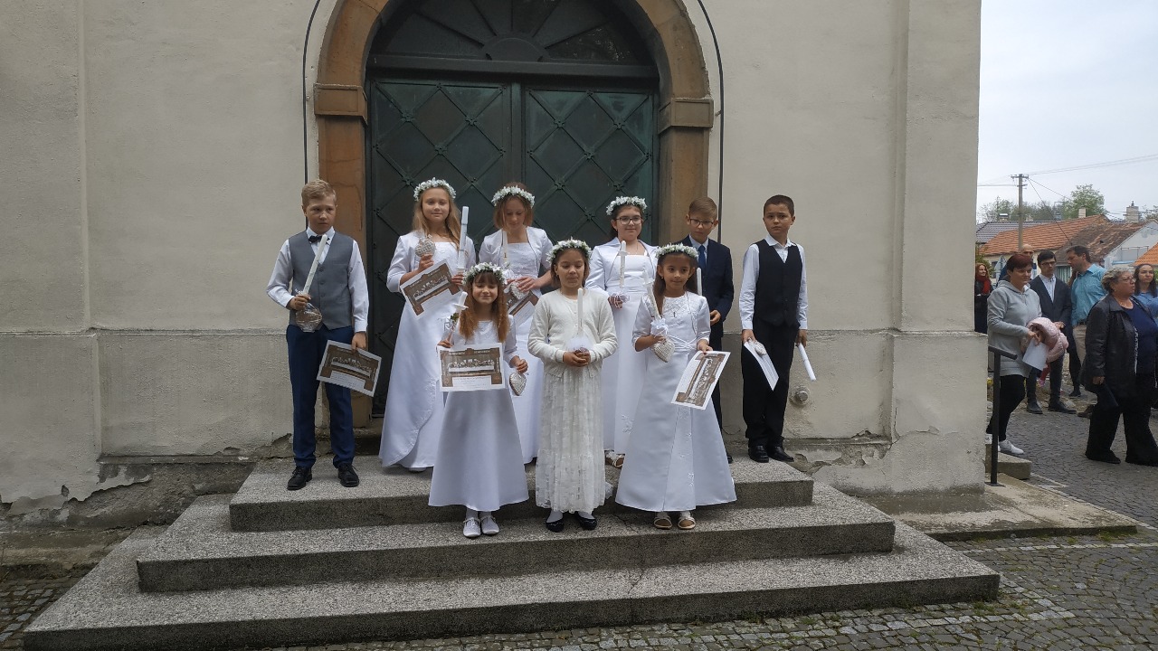 Na čtvrtou neděli velikonoční byla v naší farnosti velká sláva. K 1. svatému přijímání přistoupilo 9 dětí (6 dívek a 3 chlapci). Kostel byl krásně vyzdoben, mší svatou doprovodila krásně schola maminek a dětí a byla to vskutku oslava k Boží chvále. Děkujeme všem, kteří se jakkoliv podíleli na této Boží slavnosti. Přejeme dětem i rodičům, aby si víru udrželi po celý život a dokázali ji předávat i dál.